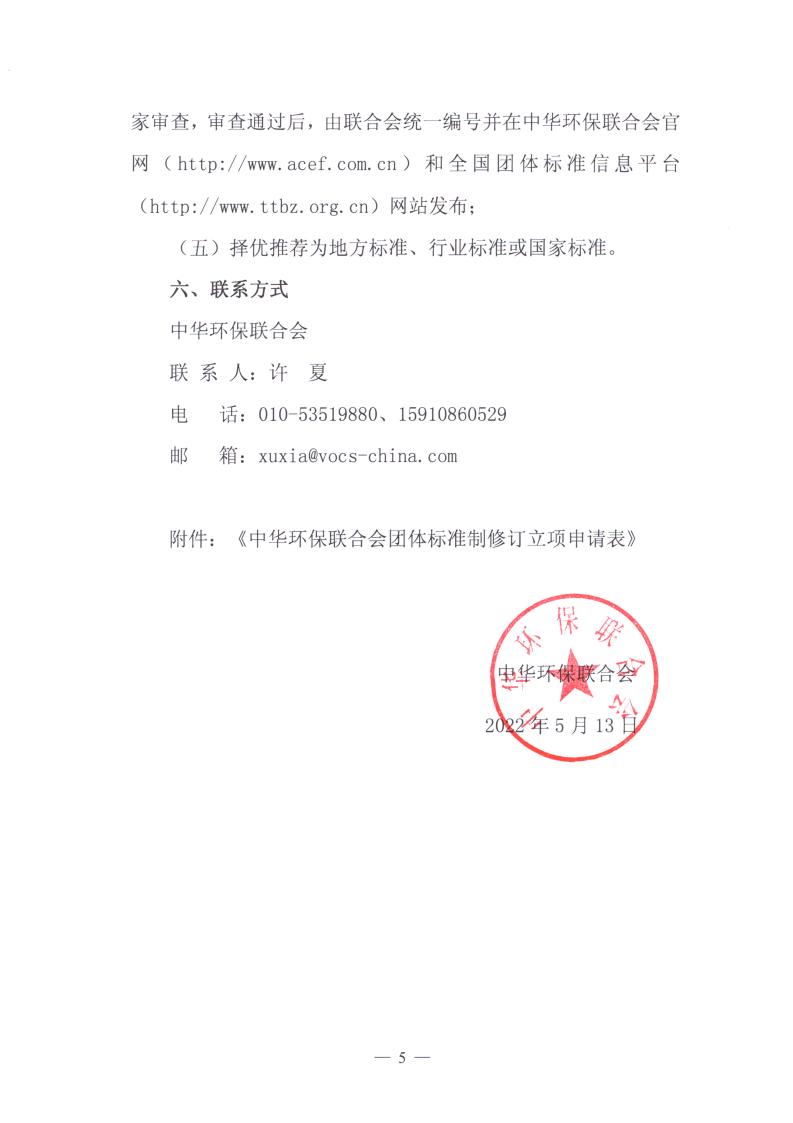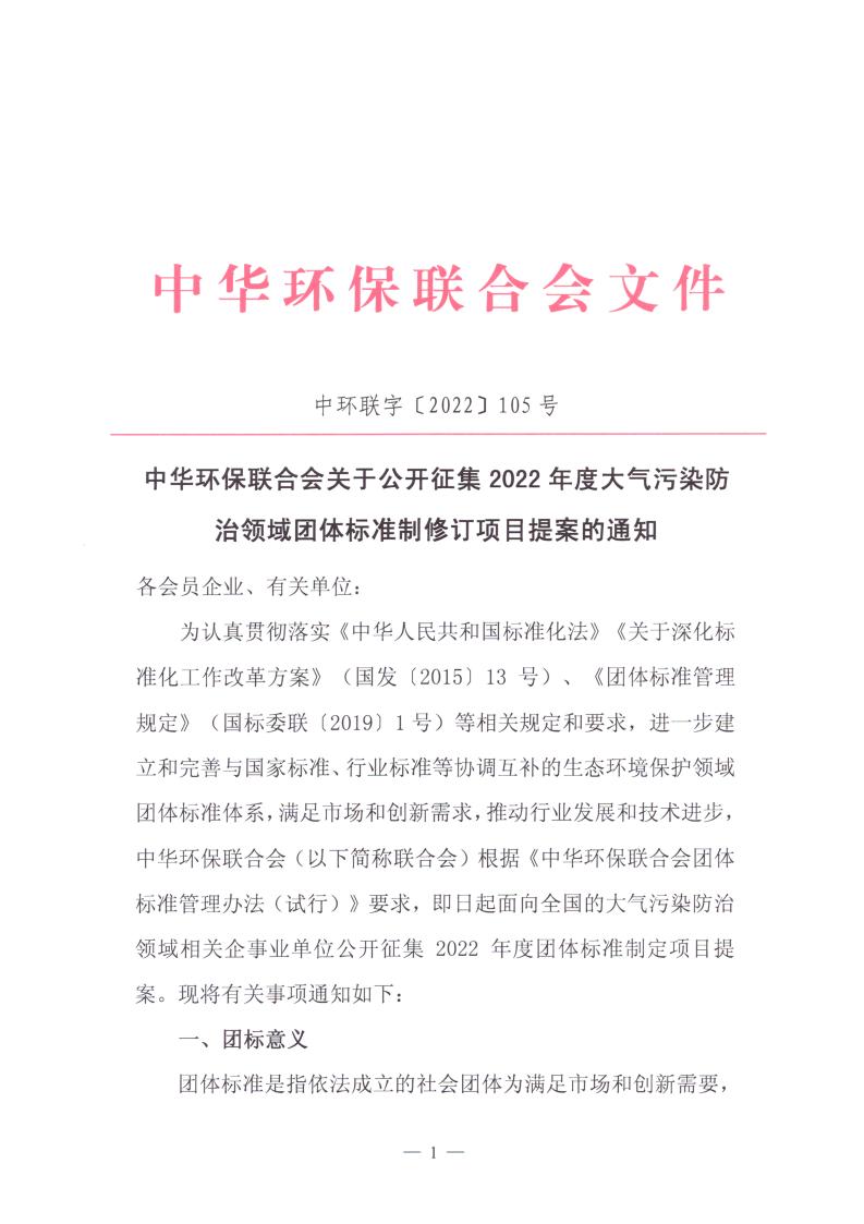 中华环保联合会关于公开征集2022年度大气污染防治领域团体标准制修订项目提案的通知