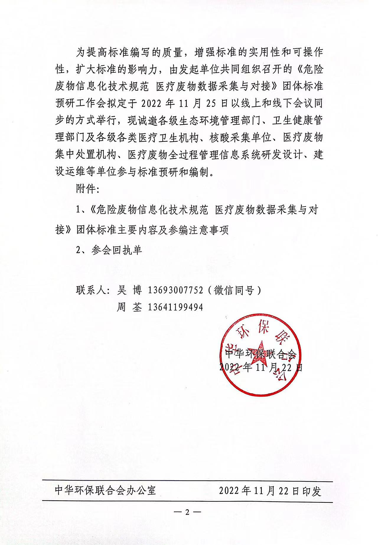 关于邀请参加团体标准《危险废物信息化技术规范 医疗废物数据采集与对接》预研工作会的函