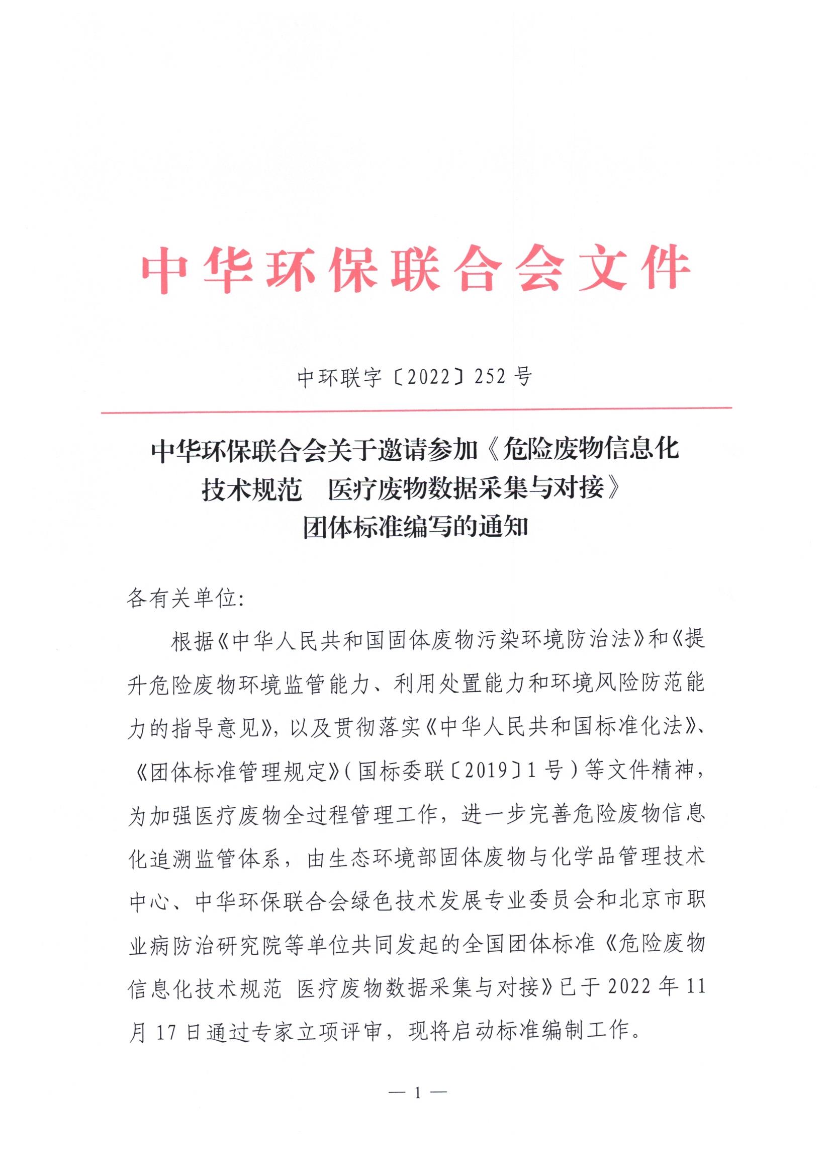 关于邀请参加《危险废物信息化技术规范 医疗废物数据采集与对接》团体标准编写的通知