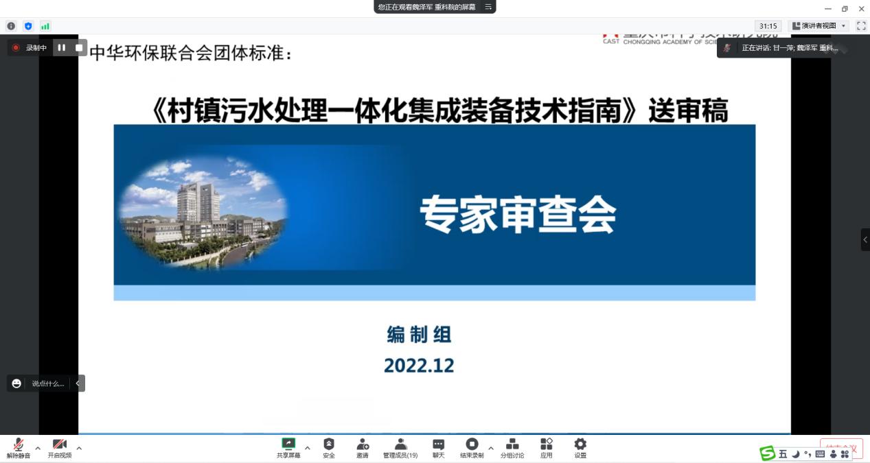 重庆市科学技术研究院魏泽军教授、国能龙源环保有限公司煤炭与化工事业部张鑫高工、技术部经理袁志丹分别代表主编单位对《村镇污水处理一体化集成装备技术指南》、《燃煤锅炉脱硫废水烟气余热浓缩干燥技术指南》、《污泥高温间接干化冷凝废水处理工程技术规程》编制情况进行了汇报,并就标准征求意见稿公开征求意见情况进行重点介绍。