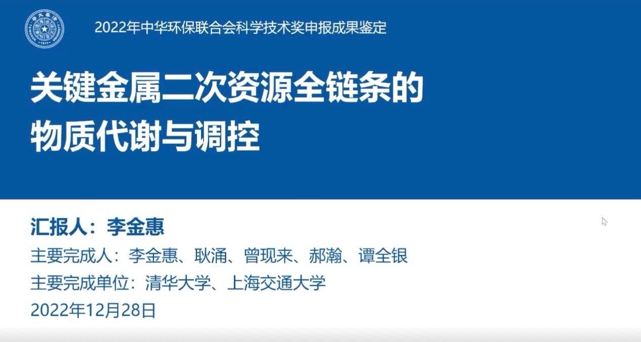 第二个评价项目是清华大学和上海交通大学申请的关键金属二次资源全链条的物质代谢与调控”科研成果,由项目汇报人李金惠向专家组进行了详细的汇报并回答了相关问题。
