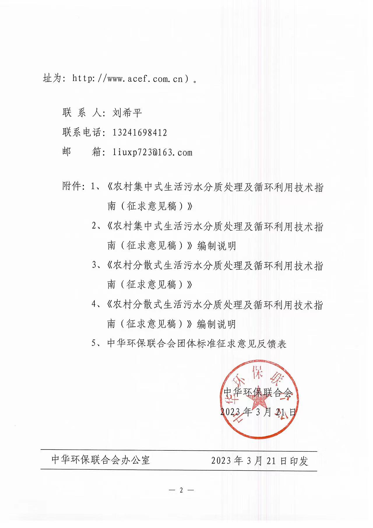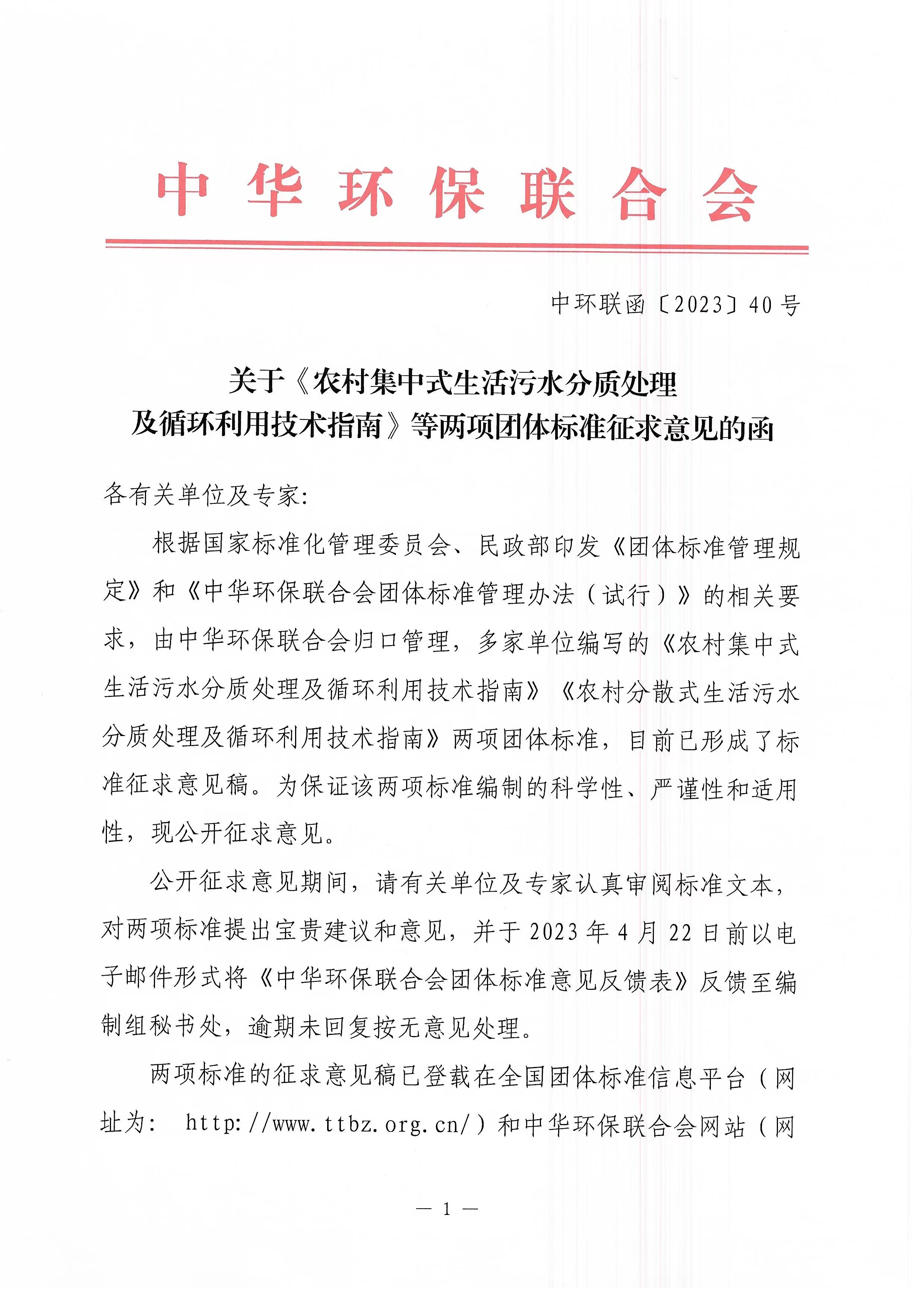 关于《农村集中式生活污水分质处理及循环利用技术指南》等两项团体标准征求意见的函