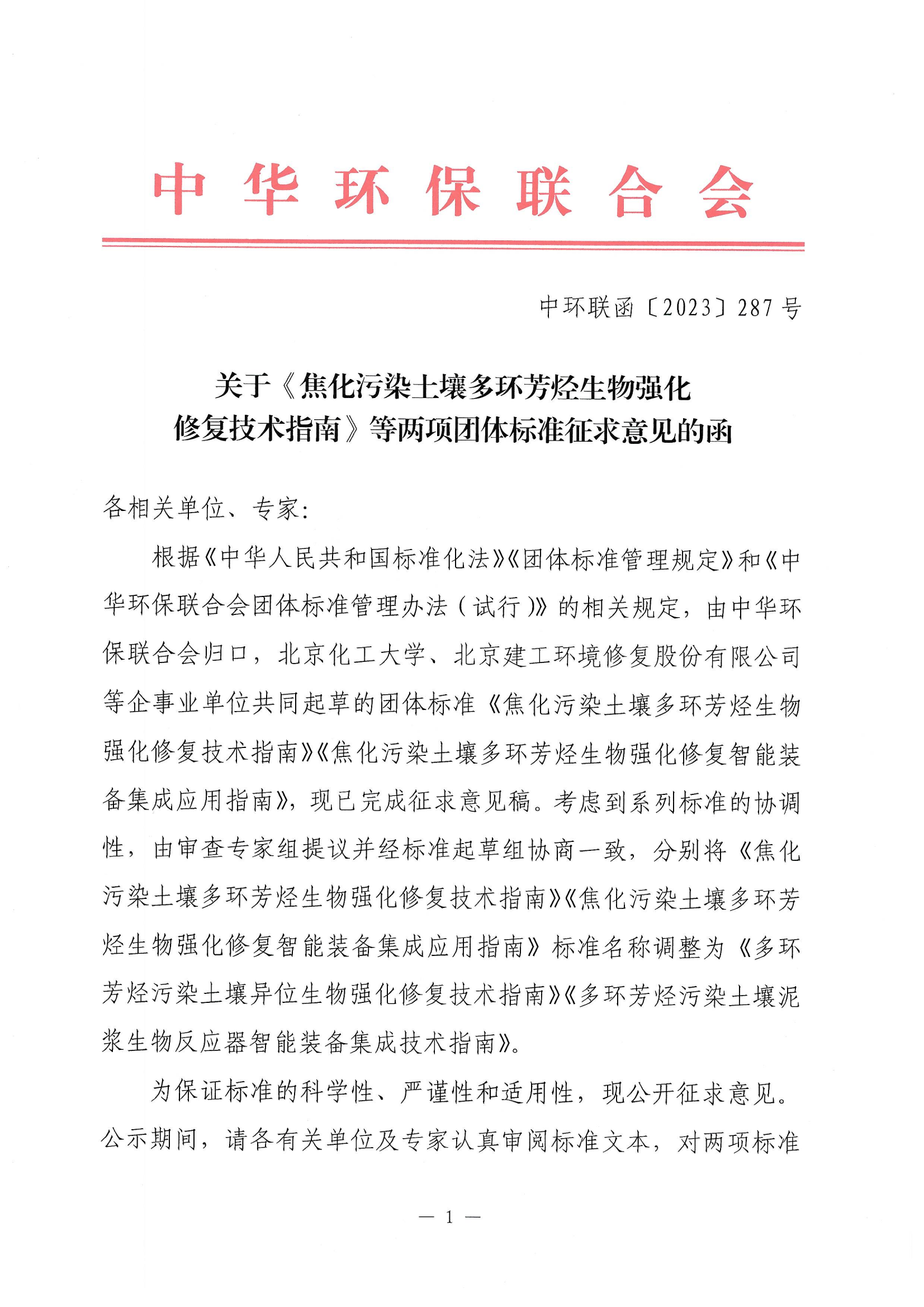 关于《焦化污染土壤多环芳烃生物强化修复技术指南》等两项团体标准征求意见的函 |