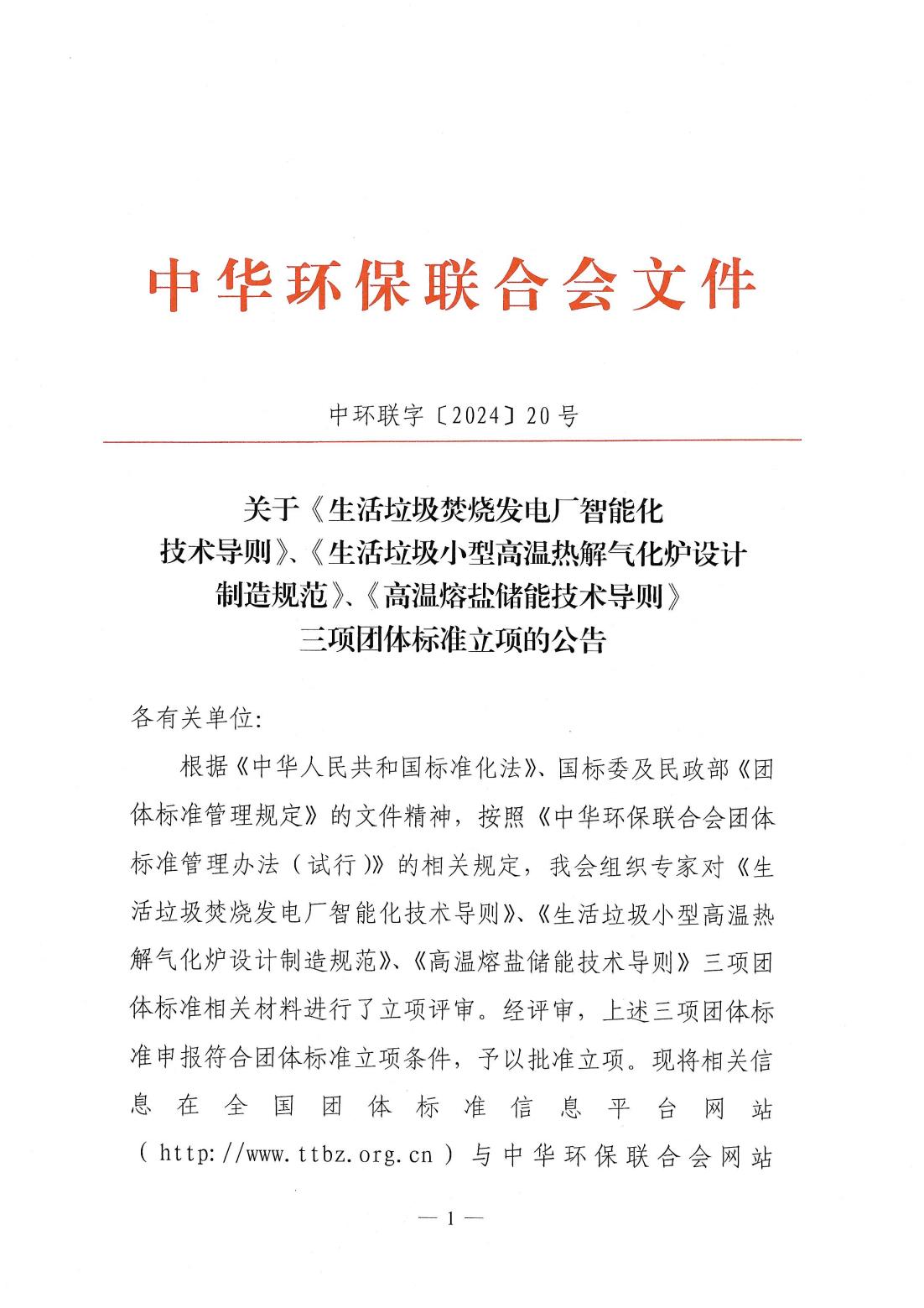 关于《生活垃圾焚烧发电厂智能化技术导则》、《生活垃圾小型高温热解气化炉设计制造规范》、《高温熔盐储能技术导则》三项团体标准立项的公告