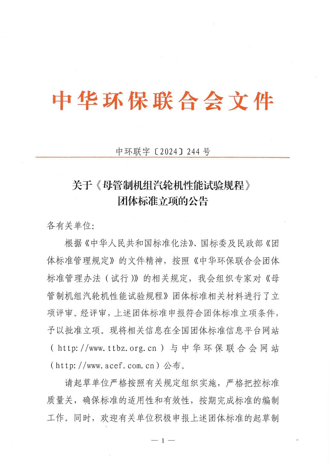 关于《母管制机组汽轮机性能试验规程》团体标准立项的公告