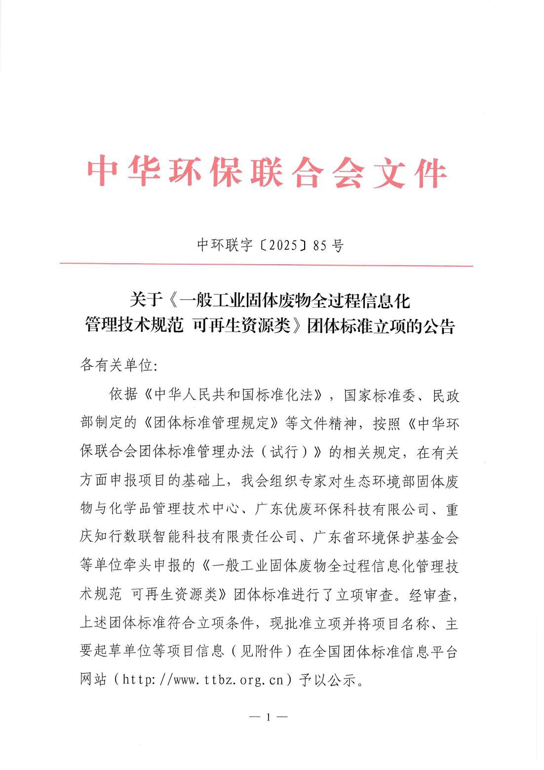 关于《一般工业固体废物全过程信息化管理技术规范 可再生资源类》团体标准立项的公告