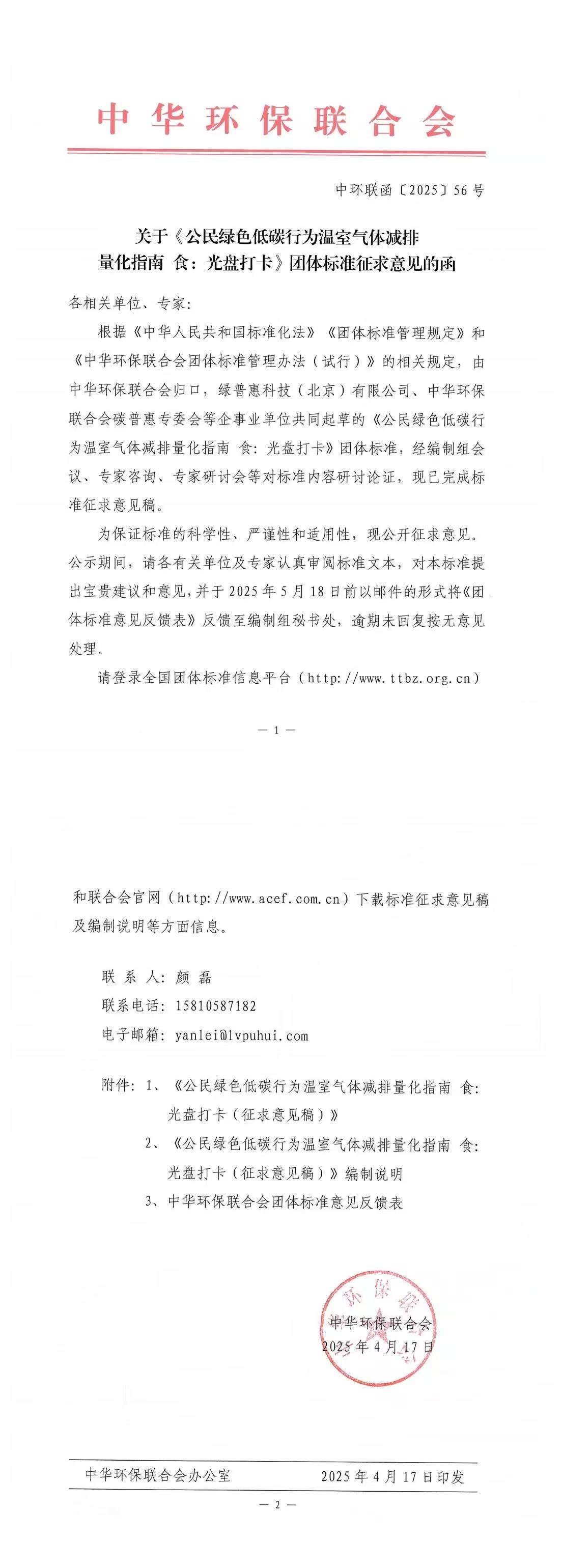 关于《公民绿色低碳行为温室气体减排量化指南 食:光盘打卡》团体标准征求意见的函