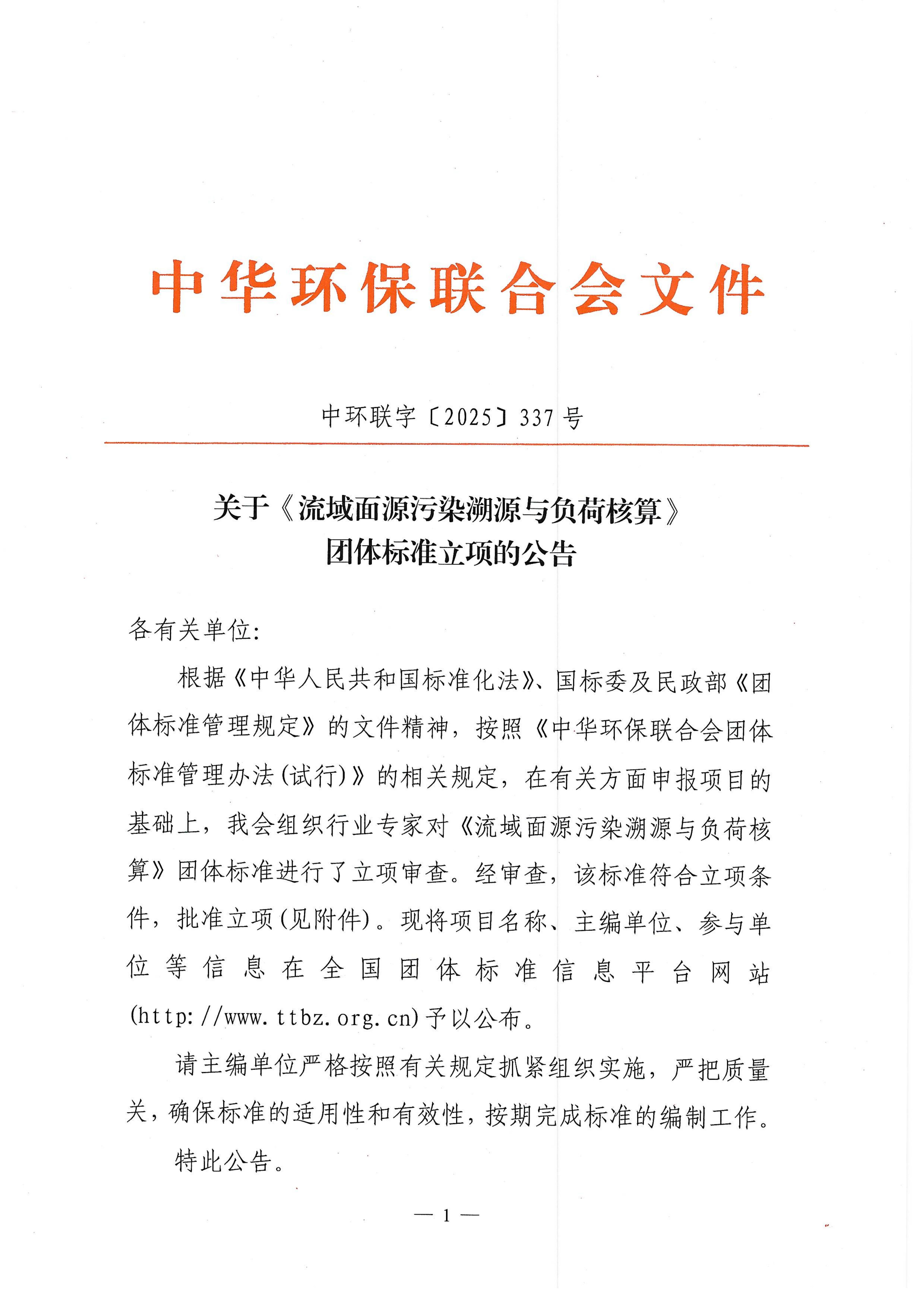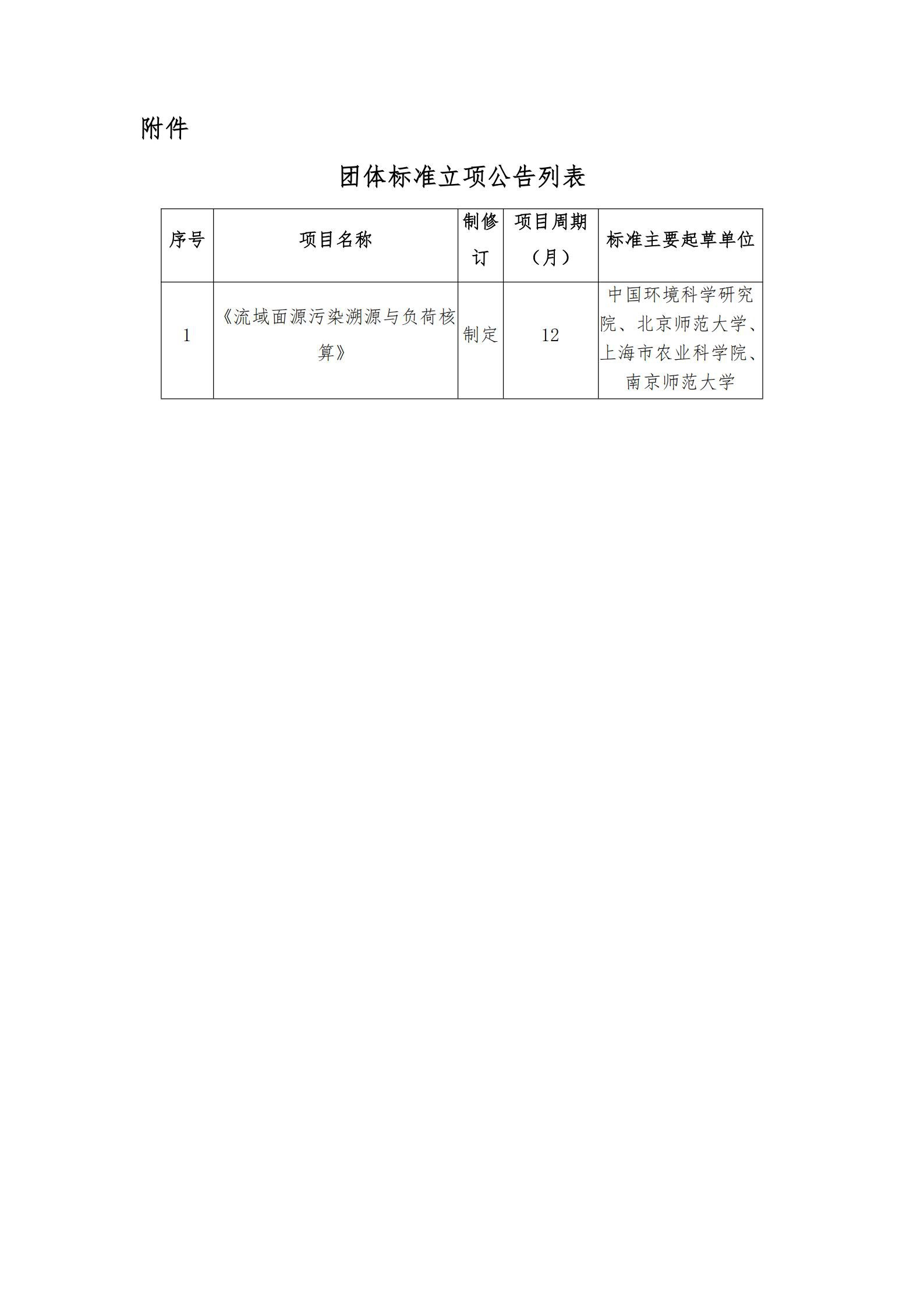 关于《流域面源污染溯源与负荷核算》团体标准立项的公告
