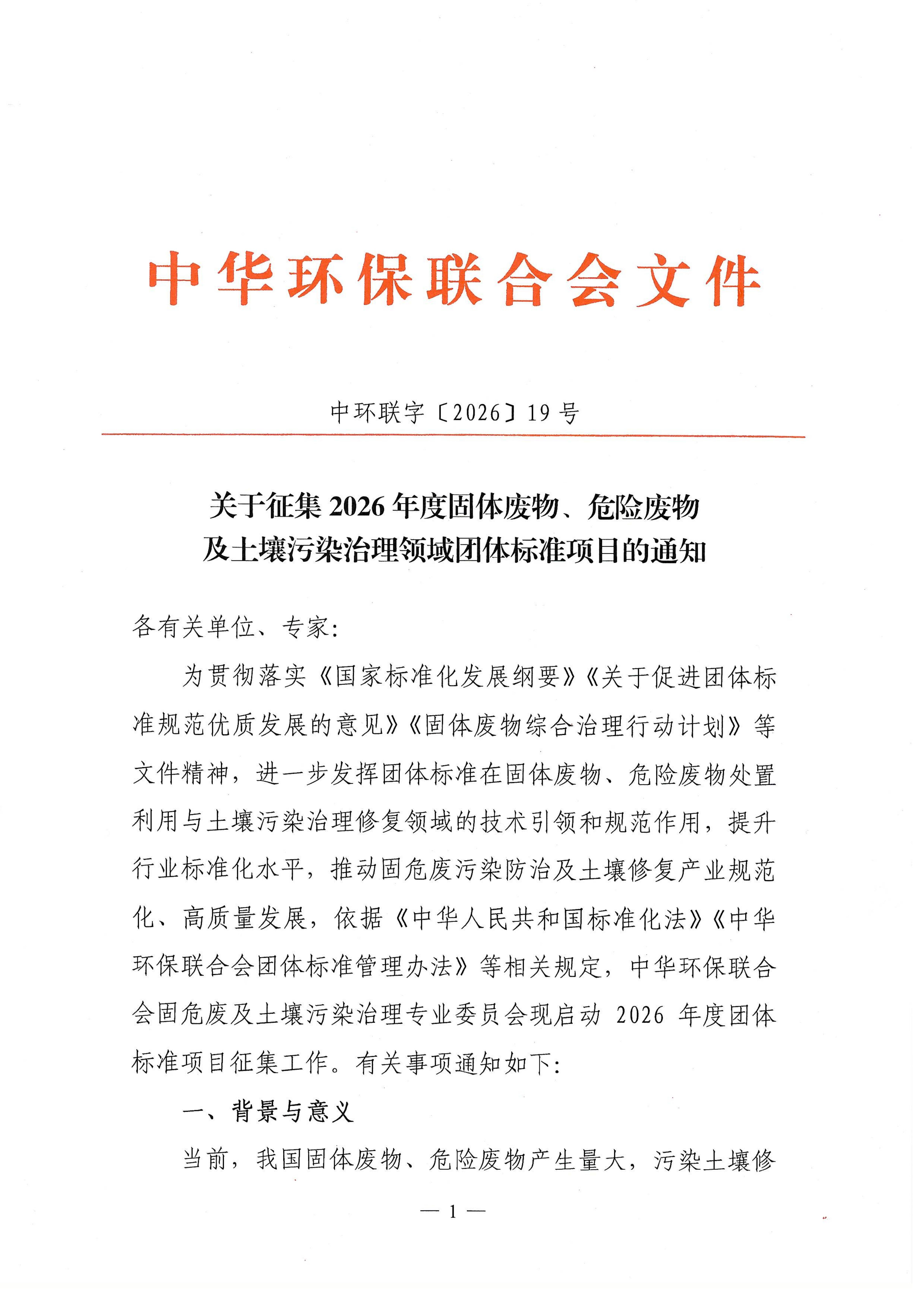关于征集2026年度固体废物、危险废物及土壤污染治理领域团体标准项目的通知