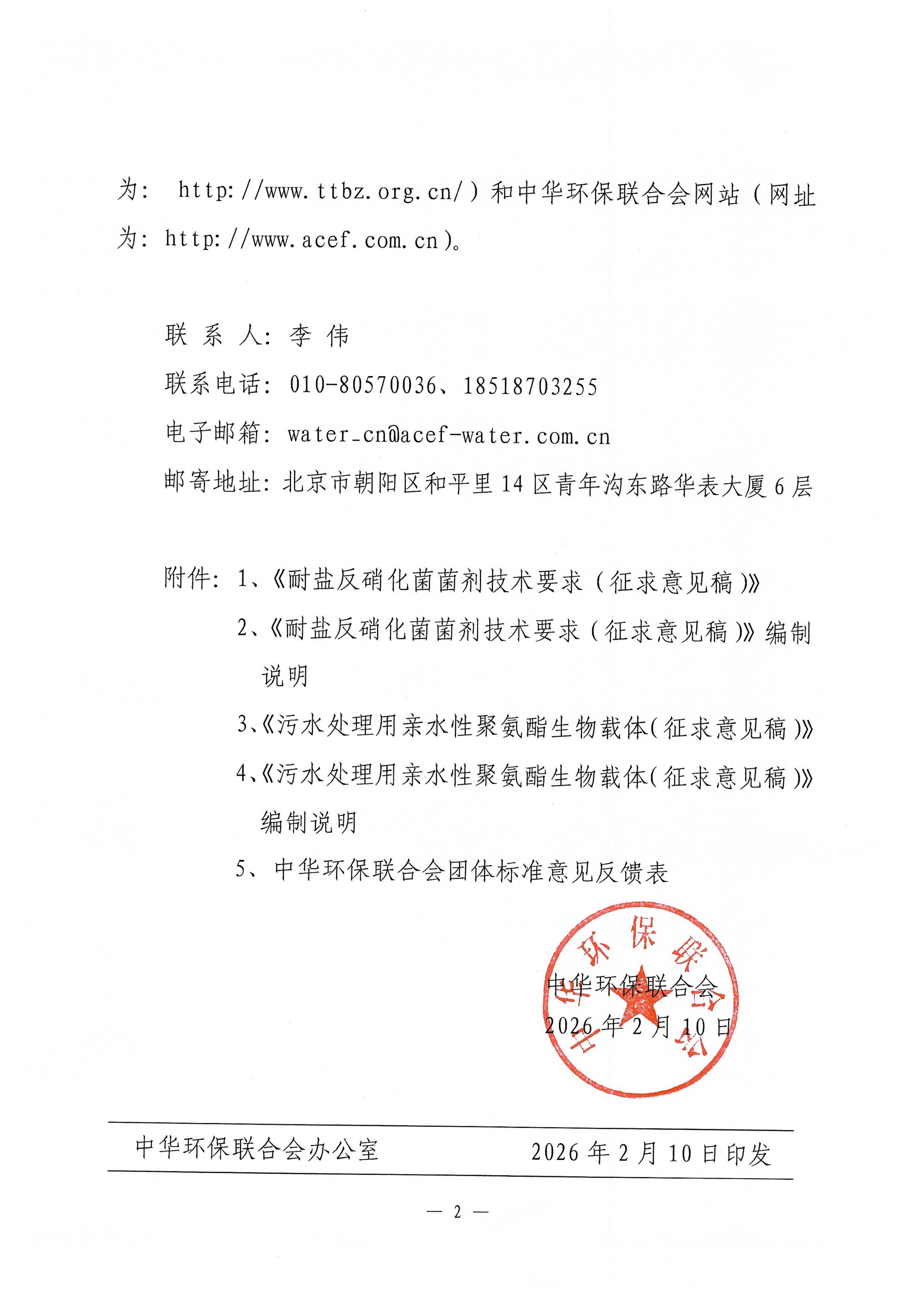 关于《耐盐反硝化菌菌剂技术要求》《污水处理用亲水性聚氨酯生物载体》两项团体标准征求意见的函