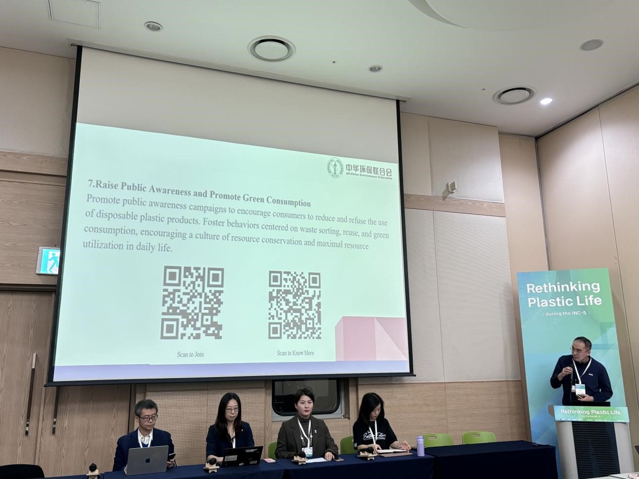INC-5谈判启动第二天,中华环保联合会与SEE基金会、深圳零废弃等相关中国民间组织围绕“地方行动,全球影响:中国社会组织应对塑料污染的解决方案和经验”主题,在INC-5官方边会室组织了边会活动,围绕中国民间组织INC-5联合倡议、公众倡导、电商去毒、新塑料污染、塑料公约必要事项等内容进行了案例分享和展示,并通过问答互动环节,与各国来宾进行了对话交流。