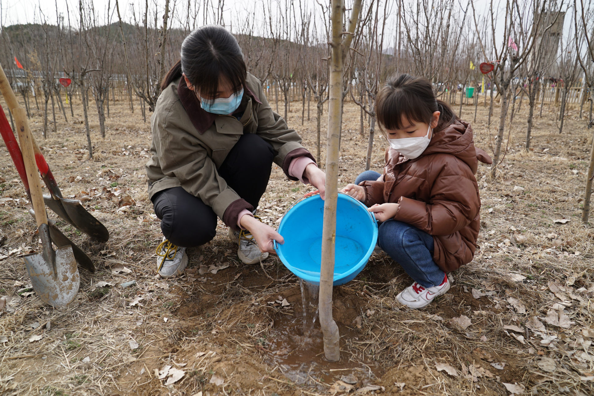 来参加义务植树尽责活动的,以亲子家庭为主,他们共同为绿地搂干草、整理树堰、浇水。还有的在补种西府海棠,整个植树基地处处是热火朝天的劳动景象。