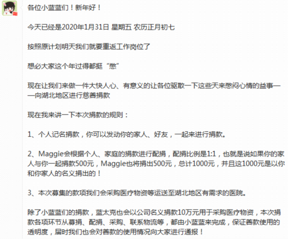 隔离病毒,不隔离爱。这是我们的第一批捐赠,我们还在持续关注疫情,多方联系,希望能将救援物资直接送达救援一线,我们坚信,在党中央国务院的领导下,全国人民万众一心,众志成城,一定能早日取得胜利!