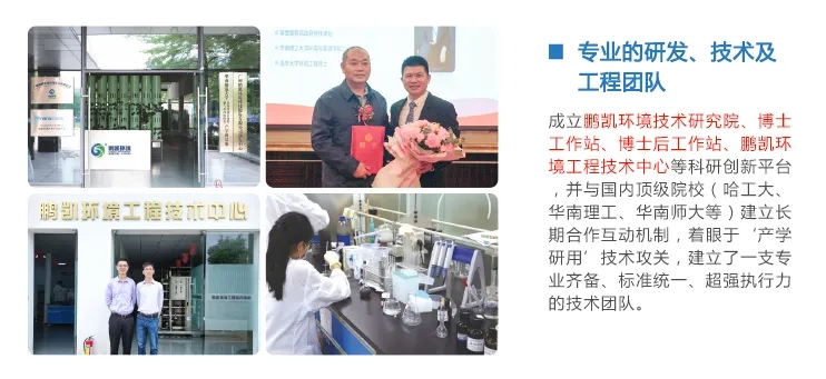 公司以“质量为先,信誉为重,管理为本,服务为诚”为宗旨,成立鹏凯环境技术研究院、博士/博士后工作站、鹏凯环境工程技术中心,并与国内顶级院校(哈工大、华南理工、华南师大等)建立合作互动机制,着眼于“产学研用”技术攻关,拥有一批高精尖的专业从事环保技术研发和环保工程服务管理团队。已取得了多项国家发明专利、实用新型专利、计算机软件著作权、高新技术产品认证。自主研发鹏凯塔(PK Tower)、鹏凯圆(PK Round)、鹏凯箱(E-co Box)等一体化处理设备和在线监测APP系统,其中核心产品“鹏凯圆”/“鹏凯塔”技术被认定为“国际领先”,“鹏凯塔”入选广东省水污染防治技术指导目录。产品主要应用于农村污水、黑臭水体处理;垃圾渗滤液处理;城镇污水处理厂扩容提标改造服务;高浓度废水处理、MVR、零排放;水体生态修复治理等领域。