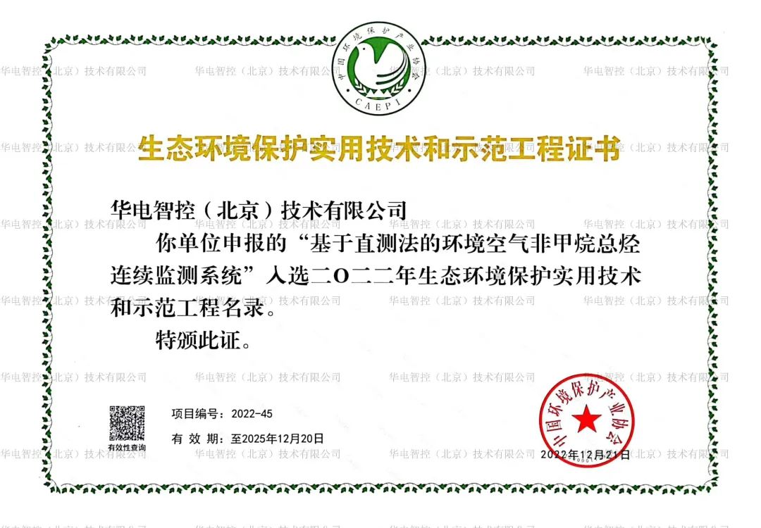 为助力打好污染防治攻坚战、推动减污降碳协同发展,加快先进适用生态环境保护技术成果推广应用,提升生态环境保护产业绿色低碳发展水平,中国环保产业协会开展2022年生态环境保护实用技术和示范工程推广工作,并发布《2022年生态环境保护实用技术和示范工程名录》,华电智控(北京)技术有限公司凭借直测法环境空气非甲烷总烃连续监测系统在众多环保设备中脱颖而出,成功入选2022年生态环境保护实用技术。