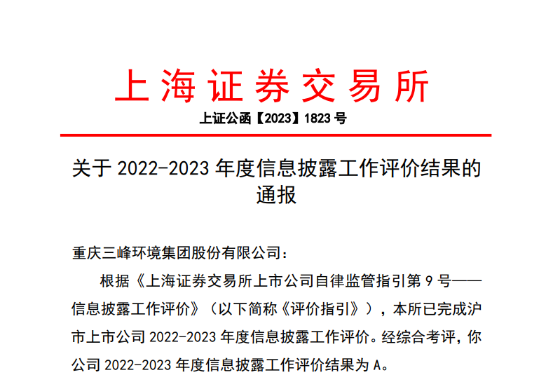 三峰环境自2020年6月5日上市以来,严格遵守各项法律法规和监管规定,真实、准确、完整、及时地做好信息披露工作,持续提升公司治理水平,以稳健的业绩分红、积极的使命担当维护广大投资者利益、履行企业社会责任,实现了持续稳健高质量发展。2020—2022年,公司累计实现营业收入168亿元、归母净利润31亿元、现金分红10亿元;信息披露工作连续三年被上交所评为A级,成为国务院国资委国有企业公司治理示范企业,在国务院国资委“双百企业”评估中获评“优秀”等级,连续六年获评“中国固废行业十大影响力企业”,三次荣登“中国环境企业50强”榜单,连续四年荣登“全球新能源企业500强”榜单。