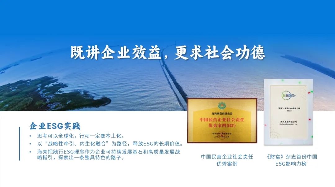 海亮集团以“既讲企业效益,更求社会功德”为发展理念,把践行ESG理念作为企业可持续发展基石和高质量发展战略指引,使其转化为更持续、更长久的内生价值驱动力。