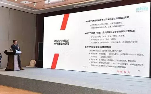 陈烈贤研究员多年研究国内外的车内空气质量标准,是国家空气净化器标准的第一起草人,发布会上,陈烈贤研究员介绍车内空气质量行业标准团体标准的制定的基本情况,现在正在起草制定《车内气味测试与评价》 和《车内空气卫生标准》。