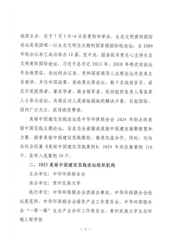 为了深入学习贯彻习近平生态文明思想,深入贯彻落实党中央、国务院关于全面推进美丽中国建设的决策部署,积极推进美丽中国建设实践,探索美丽中国建设路径,中华环保联合会拟于7月6日以生态文明贵阳国际论坛主题论坛的形式举办“2025美丽中国建设实践论坛”。