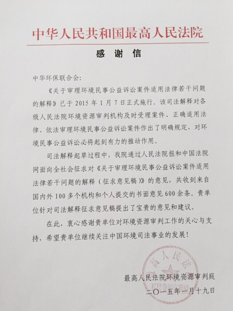 1月19日,我会收到最高人民法院寄来的感谢信,感谢我会对此次司法解释征求意见稿提出了宝贵意见和建议,感谢对环境资源审判工作的关心与支持,希望我会继续关注中国环境司法事业的发展。