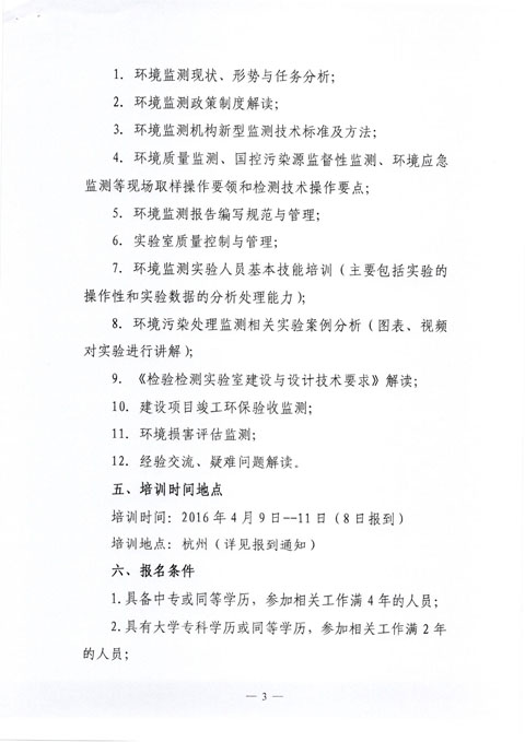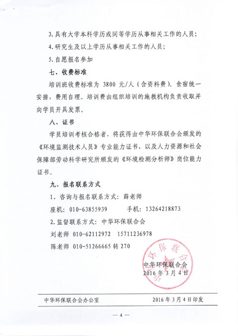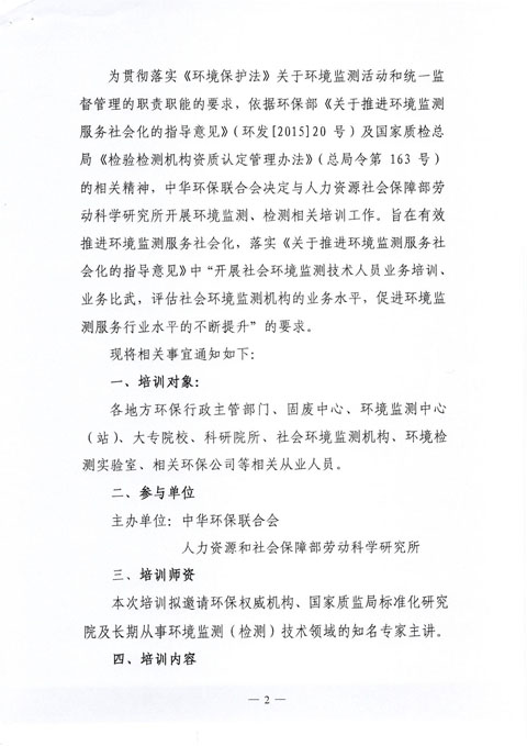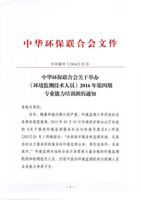 中华环保联合会关于举办《环境监测技术人员》2016年第四期专业能力培训班的通知
