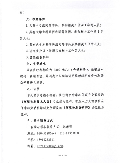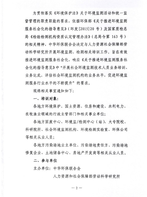 中华环保联合会关于举办《环境监测技术人员》2016年第十五期专业能力培训班的通知