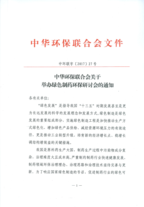 中华环保联会会关于举办绿色制药环保研讨会的通知
