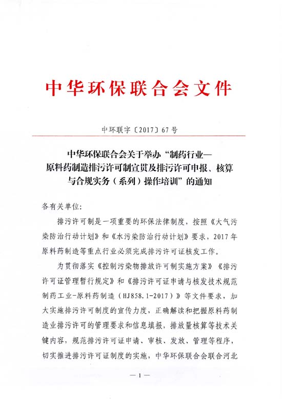 关于举办“制药行业——原料药制造排污许可制宣贯及排污许可申报、核算与合规实务(系列)操作培训”的通知