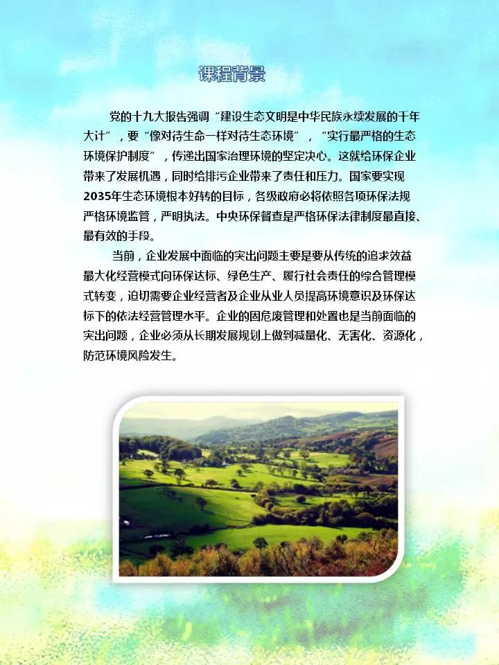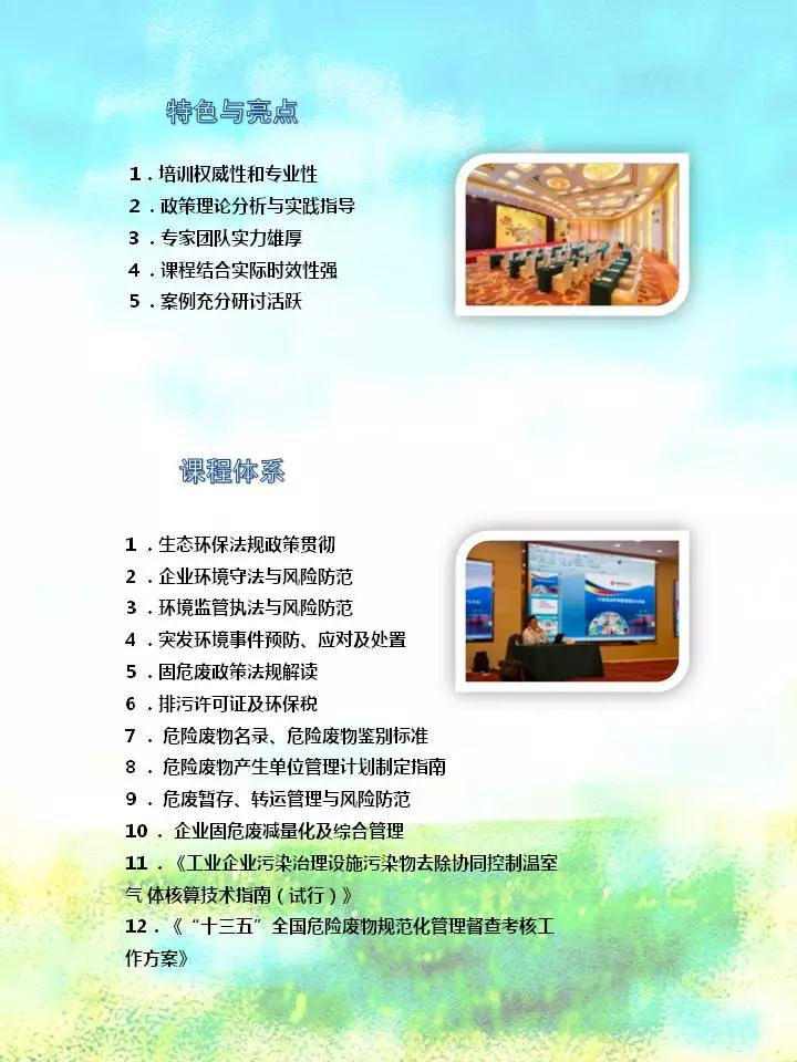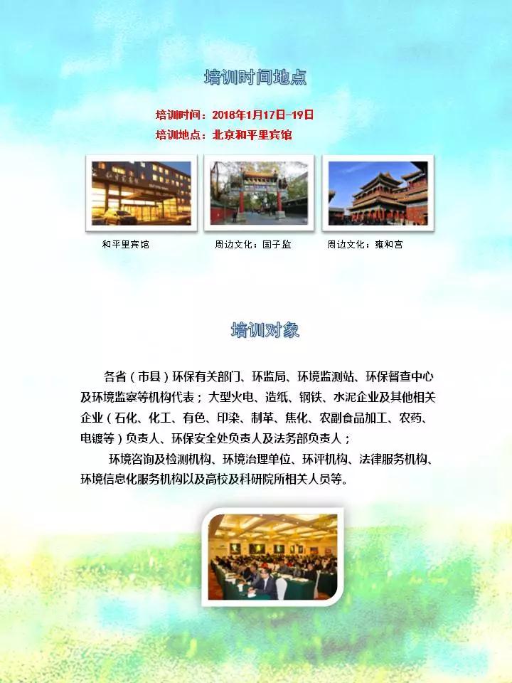 【参训对象】各省(市县)环保有关部门、环监局、环境监测站、环保督查中心及环境监察等机构代表;大型火电、造纸、钢铁、水泥企业及其他相关企业(石化、化工、有色、印染、制革、焦化、农副食品加工、农药、电镀等)负责人、环保安全处负责人及法务部负责人;环境咨询及检测机构、环境治理单位、环评机构、法律服务机构、环境信息化服务机构以及高校及科研院所相关人员等。