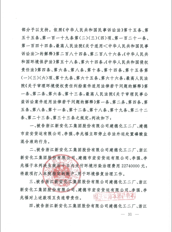 近日,中华环保联合会诉浙江新安化工集团股份有限公司等六被告环境污染公益诉讼案在山东省高级人民法院二审宣判,维持一审判决。