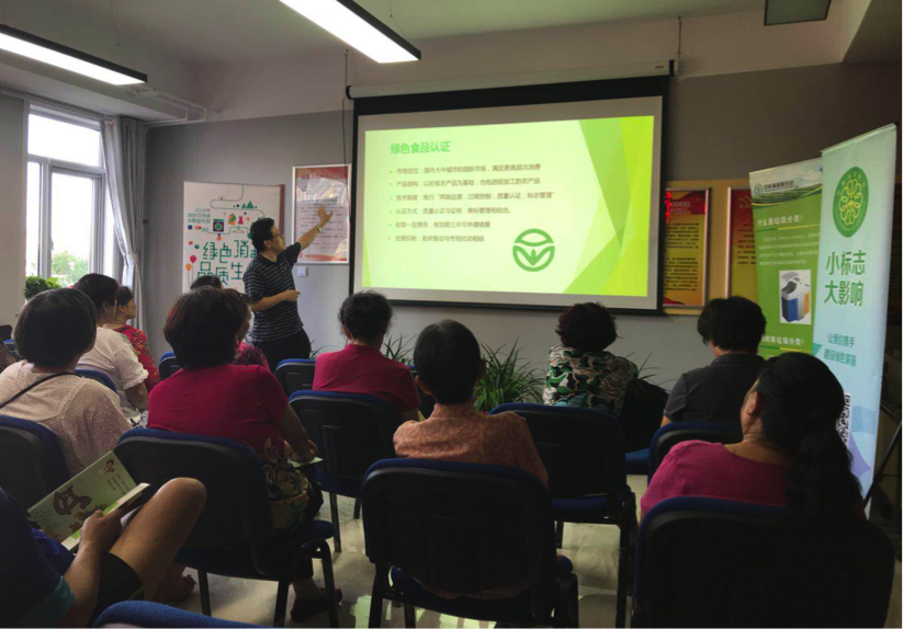 图1:首批试点社区•翠城福园开展的绿色标识科普课程,2018可持续消费周主题活动之一,由来自中检集团的专家为社区居民讲解生活中常见绿色标识的含义