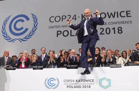 波兰卡托维兹举行的第24届联合国气候变化大会于12月15日深夜结束了《巴黎协定》实施细则的谈判,出台了“卡托维气候共识”,明确了包括透明度框架、2025年后气候资金承诺、全球气候行动盘点及技术转让进程等具体内容,最终宣告了本次大会的顺利闭幕。大会主席米哈乌•库尔蒂卡在大会闭幕现场纵身一跃,庆祝大会的成功。