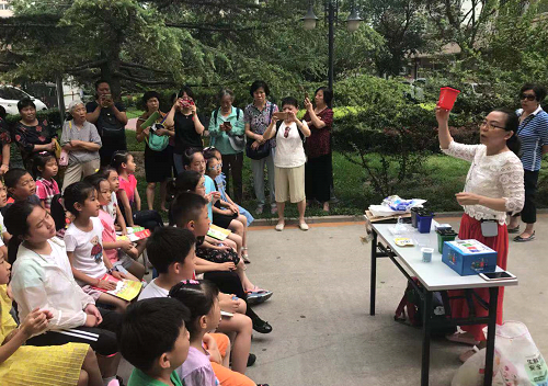 图2 社区大院内垃圾分类实践教学,一百余名学生及家长参与并由北京零废弃老师带领进行了现场分类。
