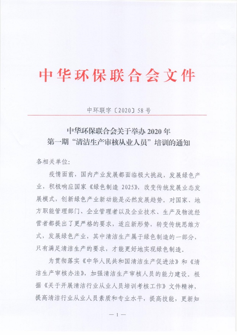 关于举办2020年第一期“清洁生产审核从业人员”培训的通知