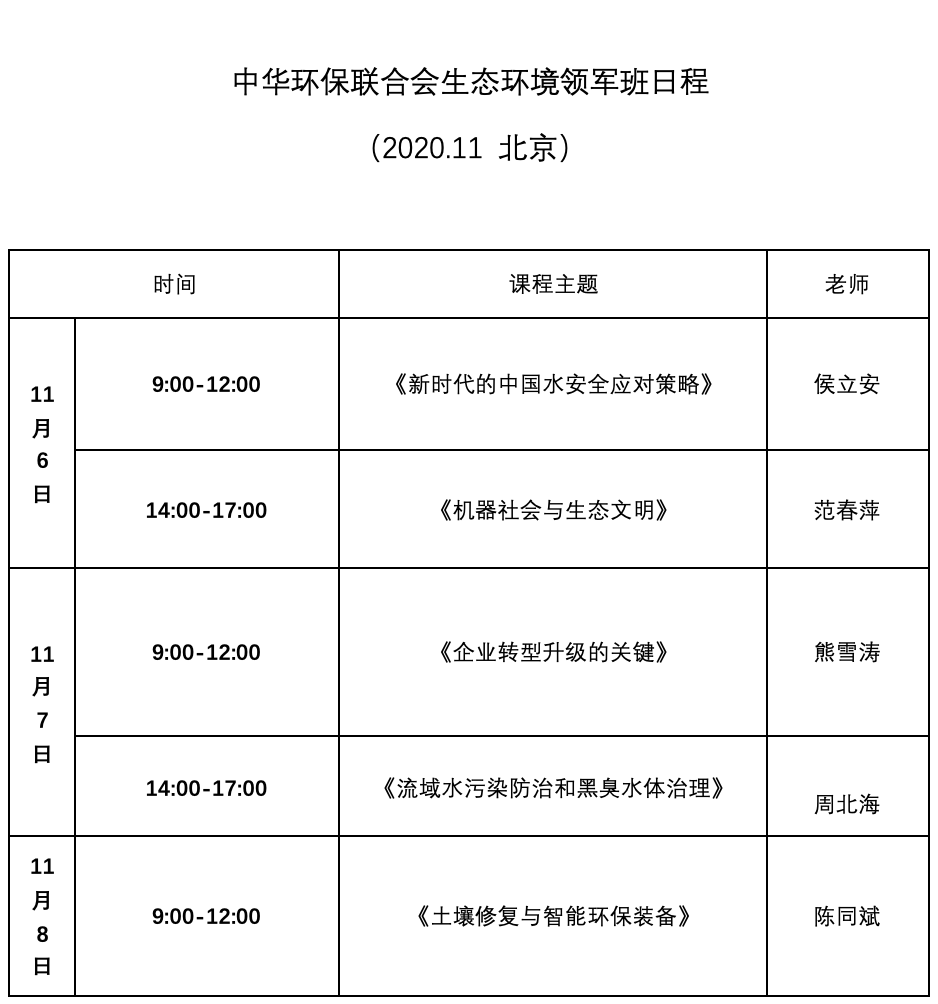 本次开课的时间为2020年11月6日-11月8日。11 月6 日-8 日领军班学员将在北京上课。本次课程行业内的顶级专家们将给大家深入分析、探讨新时代的中国水安全应对策略,机器社会与生态文明、流域水污染防治和黑臭水体治理,还有业内专家给大家解析土壤修复与智能环保装备的问题。此外,本次课程还新增了战略规划,人资管理的内容,战略规划与执行知名专家将为大家讲述企业转型升级的关键。