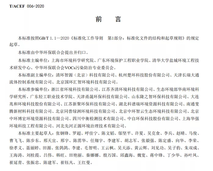 本标准主编单位:上海市环境科学研究院、广东环境保护工程职业学院、清华大学盐城环境工程技术研发中心、中华环保联合会VOCs污染防治专业委员会。