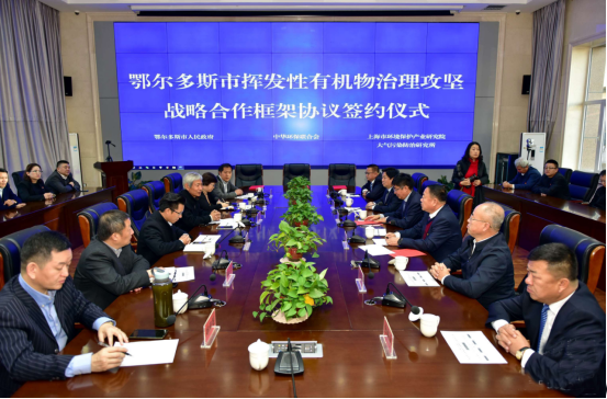 中华环保联合会、鄂尔多斯市人民政府和上海市环境保护产业研究院大气污染防治研究所于2020年11月3日在鄂尔多斯市生态环境局共同签署“鄂尔多斯市挥发性有机物治理战略合作框架协议”,鄂尔多斯市人民政府副市长李文忠和中华环保联合会副主席、生态环境部原总工程师杨朝飞共同为“鄂尔多斯市挥发性有机物治理攻坚办公室”揭牌并讲话。出席会议还有中华环保联合会副主席兼秘书长谢玉红、秘书长助理吴克食,鄂尔多斯市生态环境局局长董介中、副局长苏雅拉图、副局长孙国栋、副局长玛喜毕力格、副局长张青生,中国煤化工VOCs治理技术组组长、上海大气污染研究所所长郑承煜,上海大学科研管理部科技合作处处长焦正、生态环境部环境工程评估中心等领导专家、以及市环境局有关负责人和工作人员等。