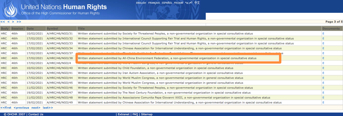联合国人权理事会第46次会议于2月22日正式召开,会期为2月22日至3月19日。中华环保联合会(All-China Environment Federation),作为拥有联合国经社理事会特别咨商地位的一家全国性环保NGO,注册参加本次大会并于会议前夕向联合国正式提交书面发言。