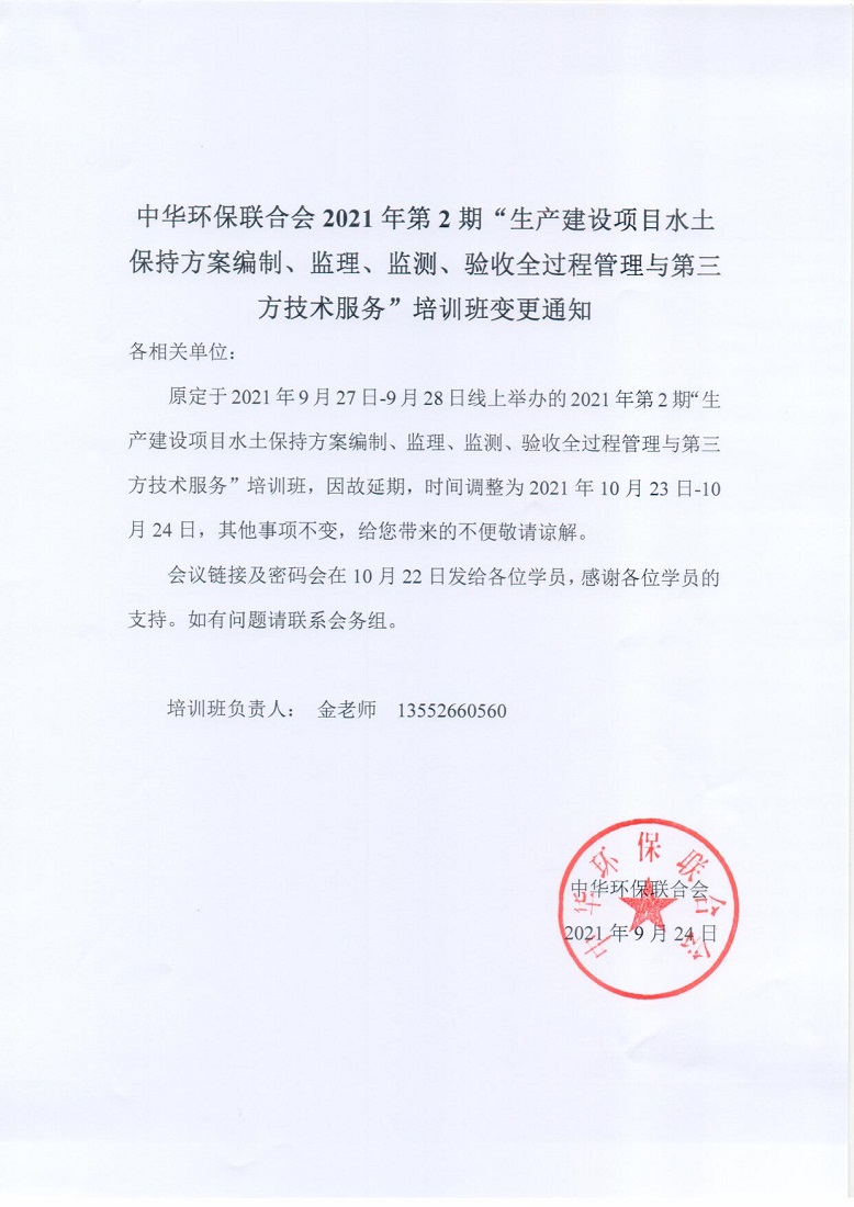 2021年第2期“生产建设项目水土保持方案编制、监理、监测、验收全过程管理与第三方技术服务”培训班变更通知