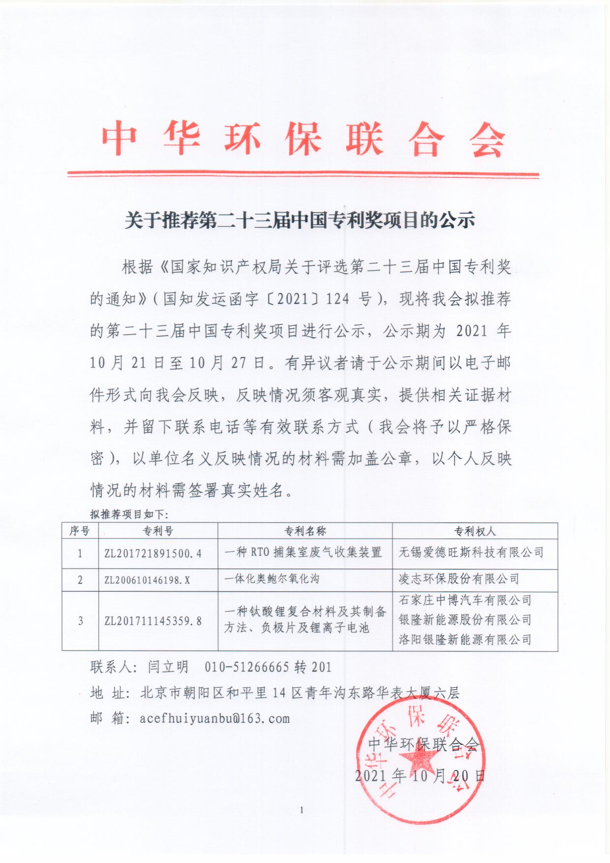 关于推荐第二十三届中国专利奖项目的公示