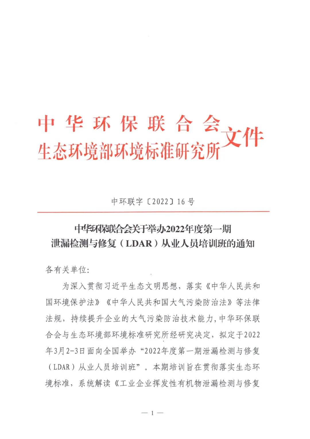关于举办2022年度第一期泄漏检测与修复(LDAR)从业人员培训班的通知