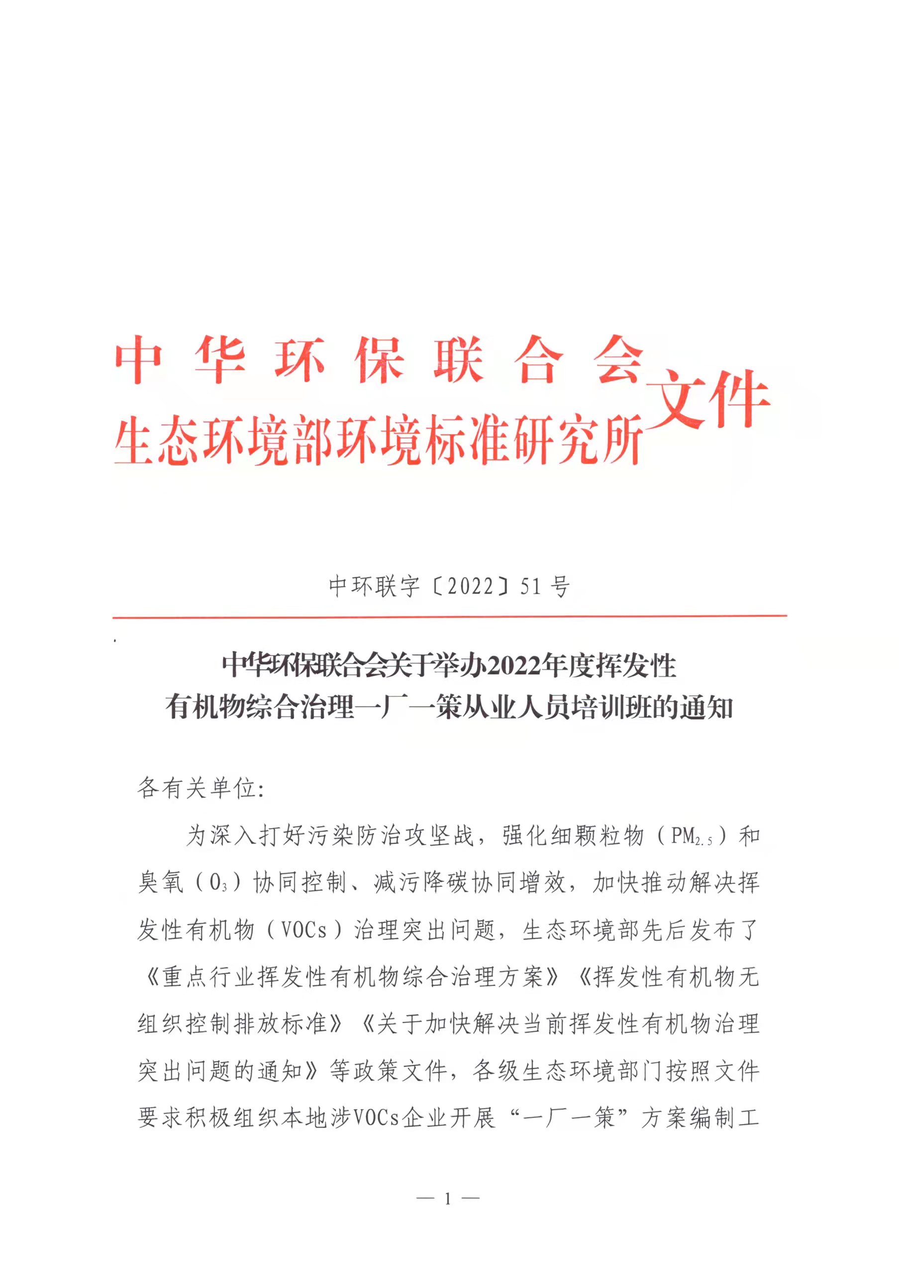 关于举办2022年度挥发性有机物综合治理一厂一策从业人员培训班的通知