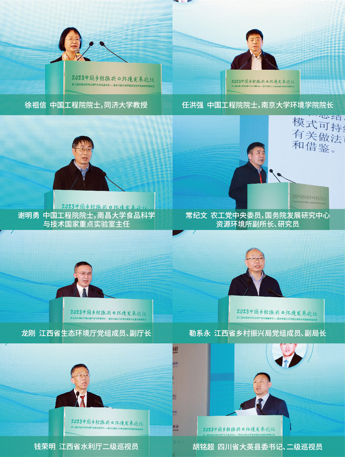 中国工程院院士、同济大学教授徐祖信、中国工程院院士、南京大学环境学院院长任洪强、中国工程院院士、南昌大学食品与技术国家重点实验室主任谢明勇、农工党中央委员、国务院发展研究中心资源环境所副所长常纪文、江西省生态环境厅党组成员、副厅长龙刚、江西省乡村振兴局党组成员、副局长勒系永、江西省水利厅二级巡视员钱荣明、四川省大英县委书记、二级巡视员胡铭超、贵州清风环保技术研究院院长付顺坤、江苏泰源环保科技股份有限公司总经理潘海龙、云南合续环境科技股份有限公司总裁李文生、佛山市玉凰生态环境科技有限公司董事长邱建贺、凌志环保股份有限公司董事长凌建军分别就“改善农村人居环境、建设美丽健康乡村”等话题进行了精彩分享,相互交流乡村振兴、环境发展经验,共同为乡村治理、水污染防治贡献智慧和力量。
