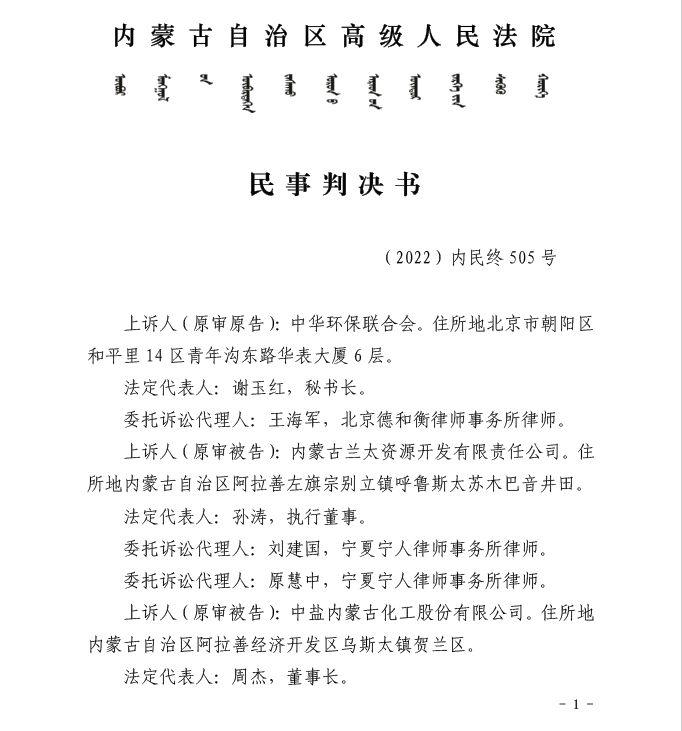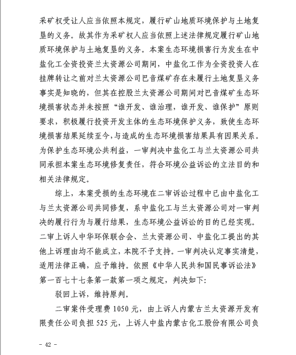 近日,内蒙古自治区高级人民法院对中华环保联合会诉内蒙古兰太资源开发有限责任公司(下称“兰太资源公司”)、中盐内蒙古化工股份有限公司(下称“中盐化工公司”)生态环境保护民事公益诉讼一案作出二审判决,驳回各方上诉,维持原判,中盐化工公司与兰太资源公司共同承担生态修复责任。
