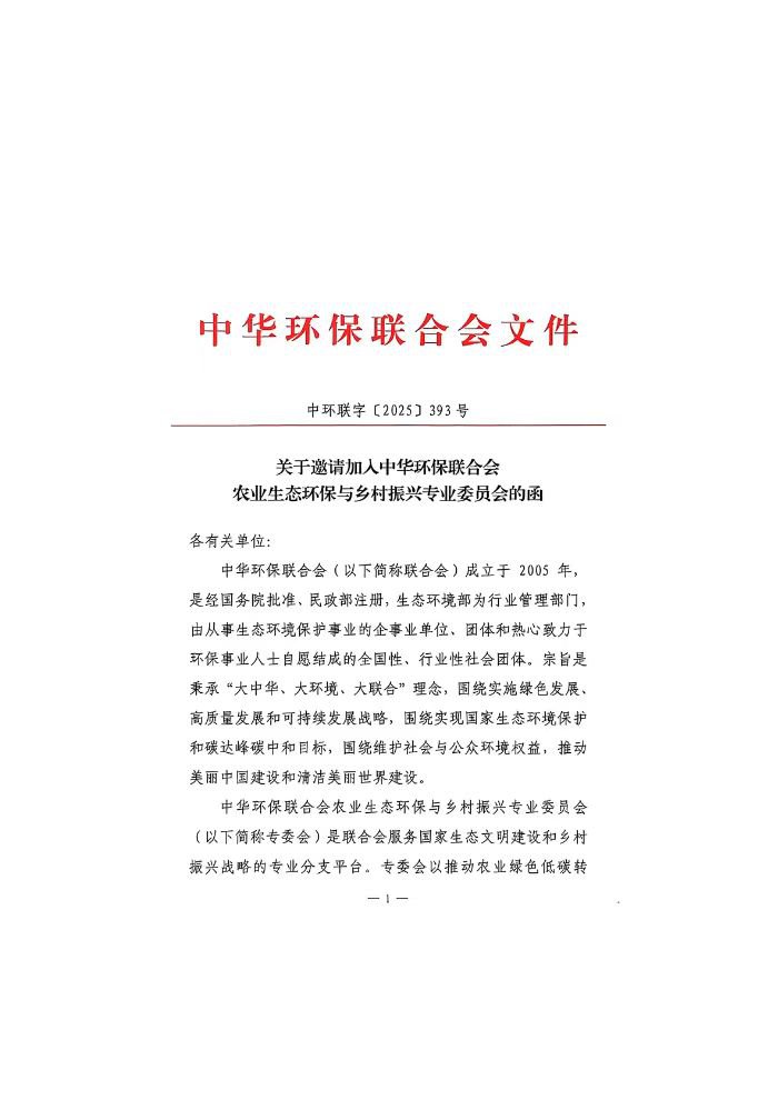 关于邀请加入中华环保联合会农业生态环保与乡村振兴专业委员会的函