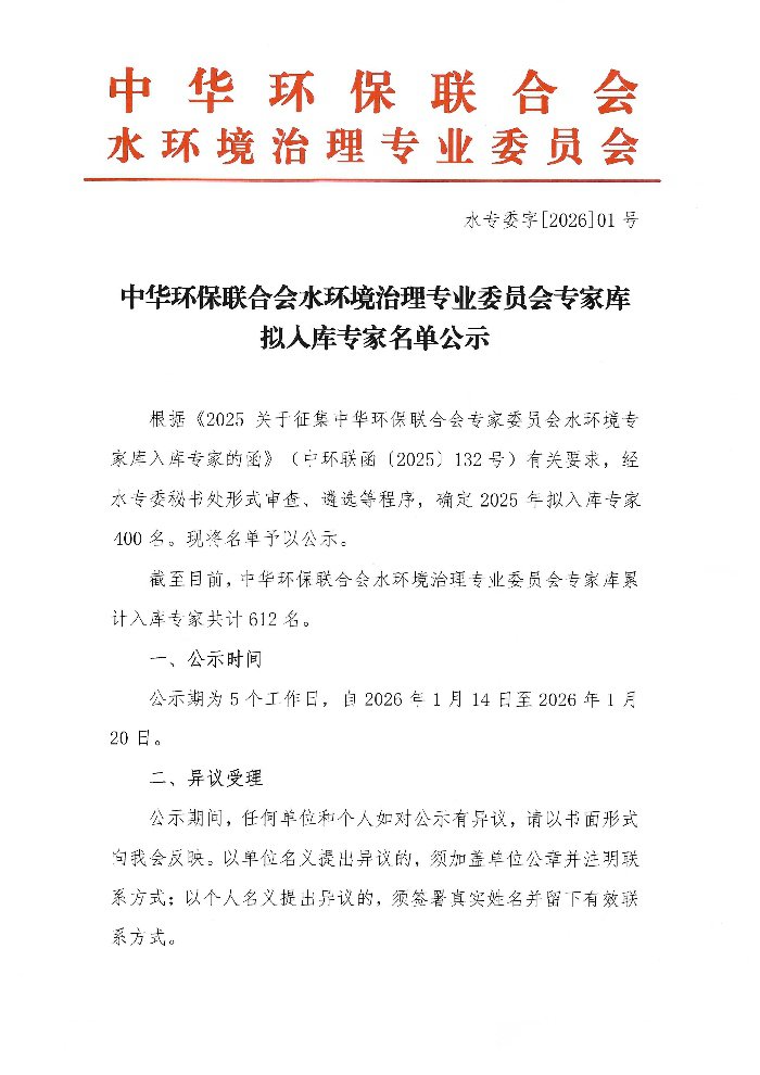 中华环保联合会水环境治理专业委员会专家库拟人库专家名单公示