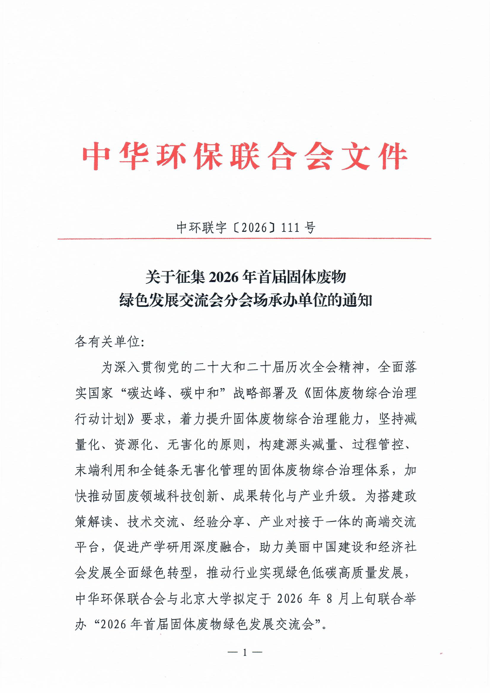 关于征集2026年首届固体废物绿色发展交流会分会场承办单位的通知