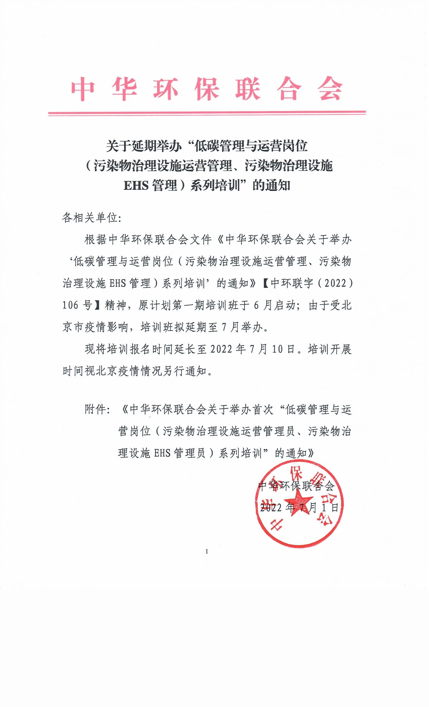 关于延期举办“低碳管理与运营岗位(污染物治理设施运营管理、污染物治理设施EHS管理)系列培训”的通知