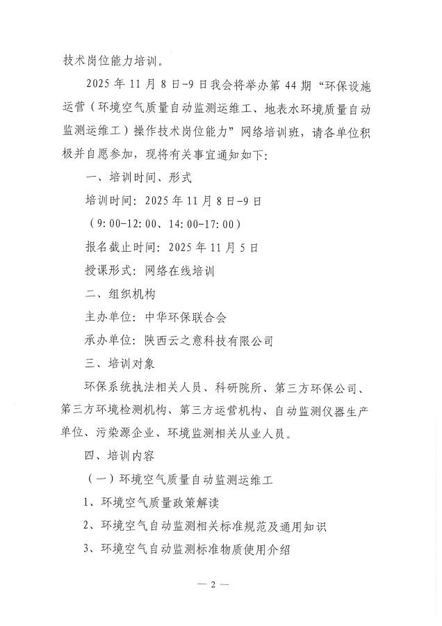 关于举办第44期“环保设施运营(环境空气质量自动监测运维工、地表水环境质量自动监测运维工)操作技术岗位能力”网络培训班的通知