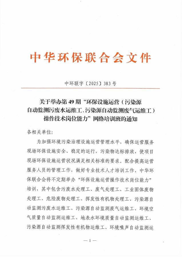 关于举办第49期“环保设施运营(污染源自动监测污废水运维工、污染源自动监测废气运维工)操作技术岗位能力”网络培训班的通知